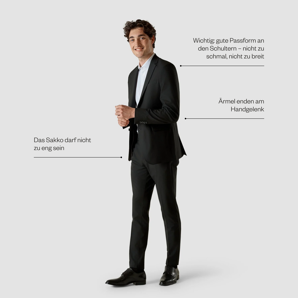 Das Revers sollte am Körper anliegen und nirgends abstehen oder Falten schlagen. Auch der Sitz an der Schulter ist sehr wichtig: Hier darf das Sakko keinesfalls zu eng oder zu schmal sein. Der Ärmel sollte am Handgelenk enden und ca. 1 cm der Manschette deines Hemdes zeigen. Aber keine Sorge: Sollte der Ärmel zu lang sein, kannst du ihn problemlos beim Schneider kürzen lassen.
