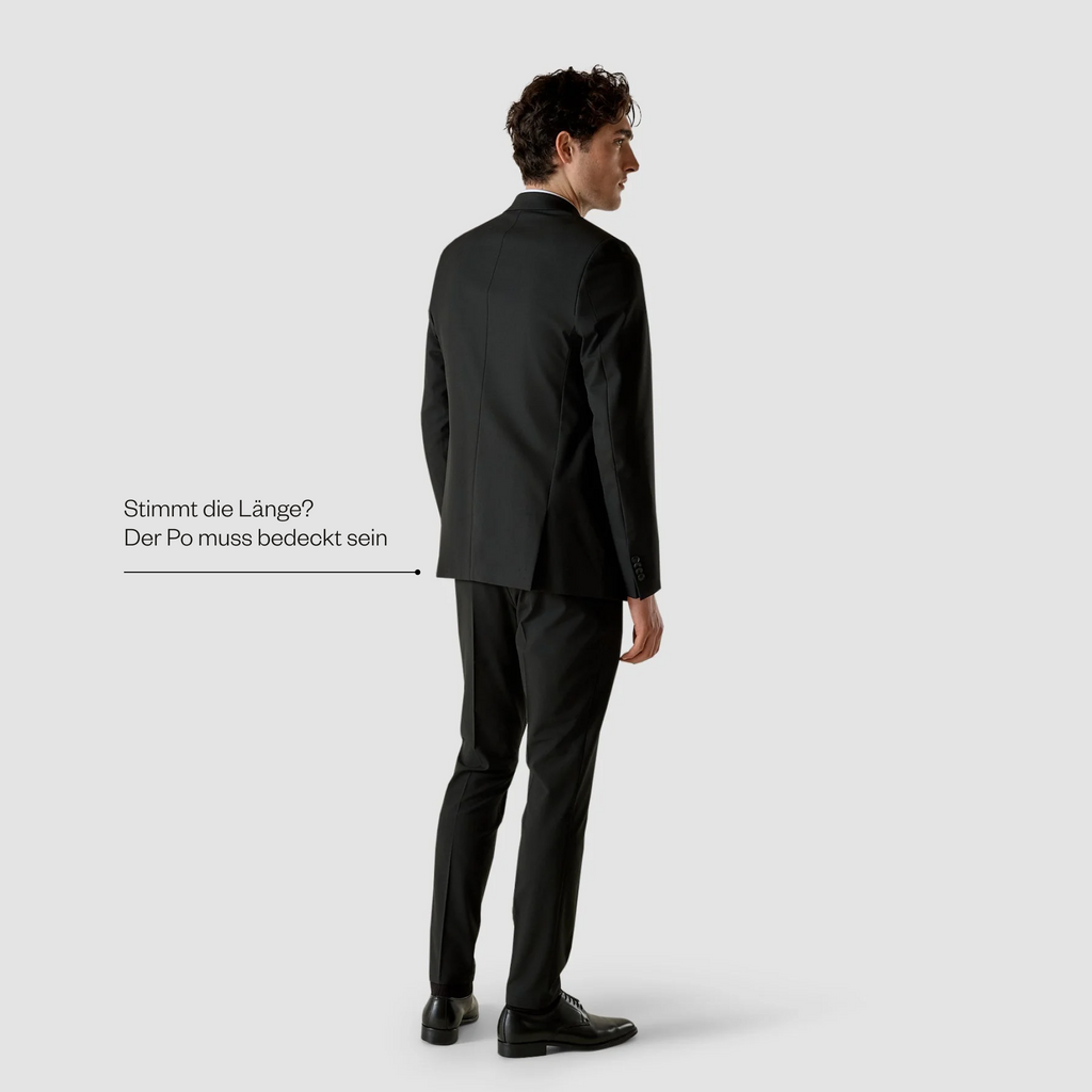 Gerade, wenn du nicht jeden Tag ein Sakko oder einen Anzug trägst, ist die richtige Passform gar nicht so leicht zu beurteilen. Dabei ist der richtige Sitz so wichtig. Zunächst einmal muss die Länge stimmen: