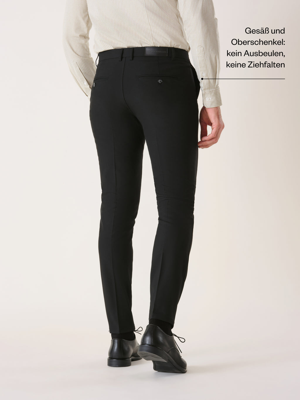 Die Anzughose muss nicht nur in der Breite und in der Länge passen. Sie muss auch am Po gut sitzen. Das heißt, sie sollte nicht nach unten ziehen und keine unschönen Falten schlagen. Das gilt auch für den Oberschenkel.